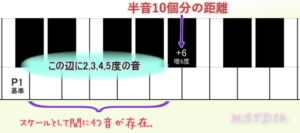 基準の音から半音距離で10個分上の音を表す間隔。基準から数えて6番目の音であるため、間にスケール上の2,3,4,5番目の音が存在する状態。