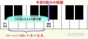 基準の音から半音距離で9つ分上の音を表す間隔。基準から数えて6番目の音であるため、間にスケール上の2,3,4,5番目の音が存在する状態。